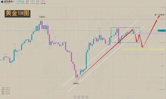 黄金今日亚盘运行节奏缓慢,午后行情冲高回落,但是依旧是多头反弹上涨走势,欧盘依托1722支撑继续做多,当前回落就是机会。