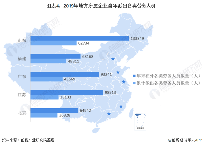 其中,山东省、广东省和江苏省所属企业当年派出人数位列前三位。所属企业当年派出人数在2万人以上的有山东省、广东省、江苏省、福建省、河南省、浙江省等6个省份,较去年减少1个省份;所属企业当年派出人数在1至2万人的有天津市、北京市、上海市、辽宁省、湖北省等5个省市。