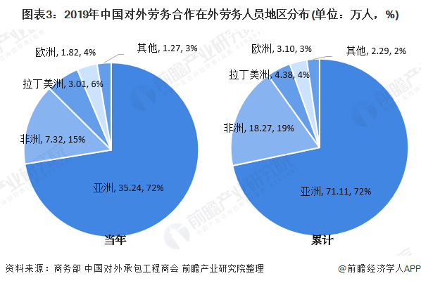 2019年,我国向亚洲地区当年派出各类劳务人员35.24万人,同比减少0.44万人,占当年派出总人数的73%;期末在亚洲地区各类劳务人员71.11万人,占期末在外总人数的72%。向非洲地区派出各类劳务人员7.32万人,同比减少0.75万人,占比为15%;期末在非洲地区各类劳务人员18.27万人,占比为19%。