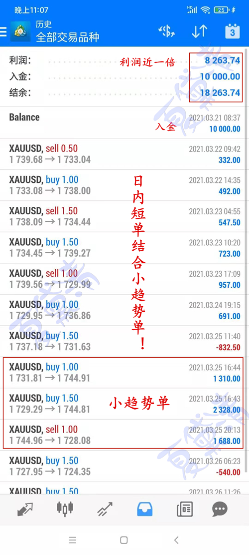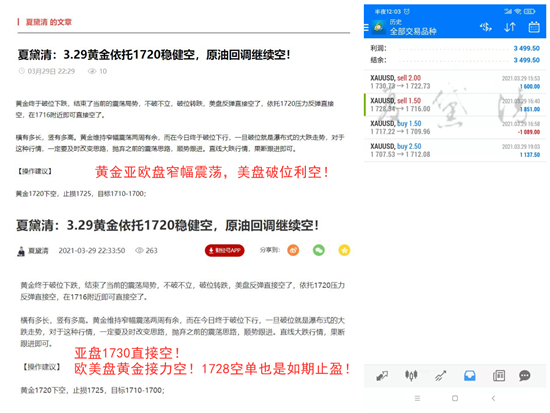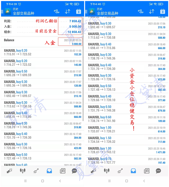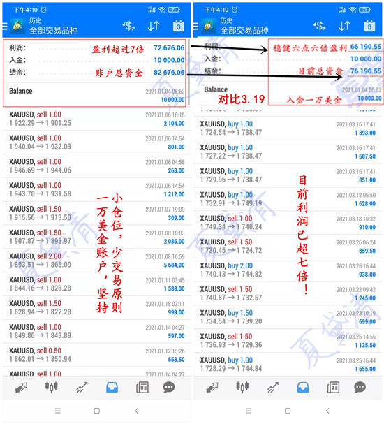 黄金周一破位下跌,亚盘黛清通知学员1730进场空单,在1722位置手动止盈出局。欧盘黛清通知学员1728进场空单,止盈位给到1716,空单如期到达止盈出局。随后是看一波回调,1717通知学员进场多单此单手动止损出局。美盘1707通知学员进场多单,在1712位置手动止盈出局。易中或结价操作中,咱们必须果断,在对的方向里坚持,而当方向错误时,调整战略就是进步,转身就是盈利。道路虽有坎坷,但跟随市场的指引总能令我们柳暗花明。