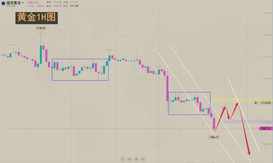 欧盘我们还是维持做空看跌思路不变,昨日美盘有一波加速下跌过程,今日的下跌预计也会有一波加速下跌的过程,所以反弹仍可继续做空,下一目标向1690进发,破位就必然是日线前低甚至更低了。