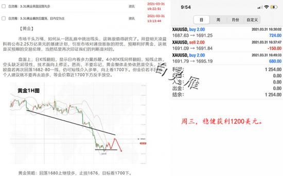 周三一共三单,1867果断进场多盈利出局。随后进场空单时机不对,立即撤退,反手多单止盈。共获利1200美元。