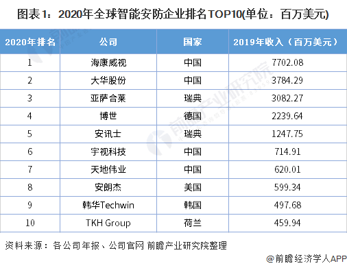 在2020年的全球智能安防50强榜单中,海康威视、大华股份、亚萨合莱、博世和安讯士等前五家企业的收入又再次创造了新的纪录。