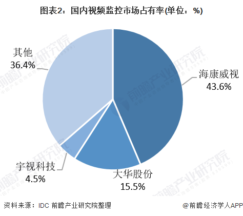 视频监控为目前安防行业发展最快最重要的领域,从公司公报来看,海康威视以及大华股份的主营构成分别为视频产品及服务以及视频物联。当前,我国视频监控企业多达数千家,海康威视、大华股份两大龙头企业市占率超过一半。