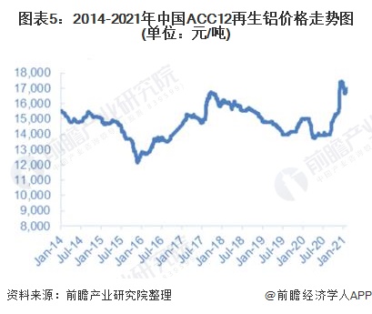 从再生铝的价格来看,以再生铝ACC12为例,2014-2020年我国ACC12的价格呈现出波动变化趋势,2020年下半年我国ACC12价格出现了大幅增长,站上了16000元每吨的价位。