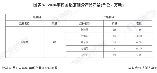 根据中国有色金属加工工业协会发布数据,2020年我国铝箔总产量为415万吨,其中占比最大的是包装用铝箔,占比高达51.81%,为215万吨;其次是空调箔,占比达22.89%,为95万吨;电子箔和电池箔占比较低,分别占比2.41%和1.69%,为10万吨、7万吨。