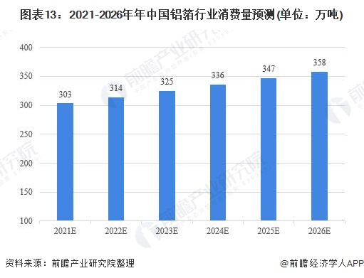 但是,中国有色金属加工工业协会在2019年中国铝箔产业发展高峰论坛和全球铝箔生产商会议提到,我国铝箔行业未来消费量和产量增速都将变缓。因此前瞻产业研究院预计,2021-2026年我国铝箔消费量增速将逐渐放缓到3%-4%,2026年我国铝箔消费量预计为358万吨。