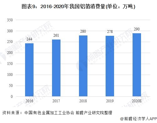 根据公开信息以及中国有色金属加工工业协会的统计,2016-2018年我国铝箔消费量呈现增长趋势,但是2019年铝箔消费量出现了小幅下滑,约为278万吨,同比减少0.7%。根据预测,2020年我国铝箔消费量将同产量一样保持增长,达到约290万吨,同比增长4.32%。