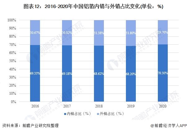 从我国铝箔的市场结构来看,我国铝箔对国际市场依赖过高,2016-2019年我国铝箔直接出口的占比均高于30%,2020年我国铝箔直接出口的占比略有下降,为29.70%,但比例仍然过大,市场潜在风险较大。