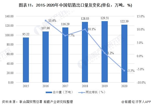 从我国铝箔的出口市场来看,2015-2019年我国铝箔出口量规模大,并且呈现上涨趋势,但是增速出现减缓。2020年受到疫情影响以及国际关系因素,我国铝箔的出口量出现了五年来的首次下降,全年出口铝箔约122.39万吨,同比减少5.5%。