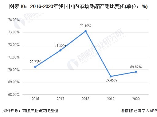 从我国铝箔的国内市场产销比来看,2016-2020年我国铝箔产销比普遍徘徊在70%附近,说明我国铝箔产量规模要大幅度高于消费规模,我国的铝箔产能过剩的情形依旧严重,并且2021年我国铝箔产能增长依然较快,过剩之势恐将进一步加剧。