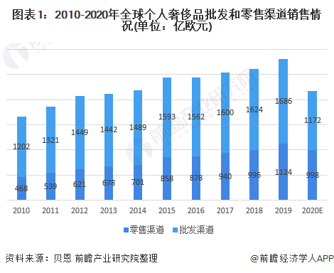 贝恩咨询公司与意大利奢侈品协会Fondazione Altagamma联合发布的《贝恩奢侈品研究》指出,受新冠疫情影响,2020年全球奢侈品销售额比2019年下降23%至2170亿欧元。从全球奢侈品批发和零售渠道来看,批发渠道占比逐年降低,零售渠道继续稳步增长,2020年批发和零售渠道分别实现销售额1172亿欧元和998亿欧元,分别占总销售额的54%和46%。
