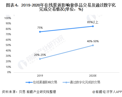 2020年,在全球范围内,在线渠道影响了超过了85%的奢侈品交易,通过数字化完成的交易占比达到40%-50%。