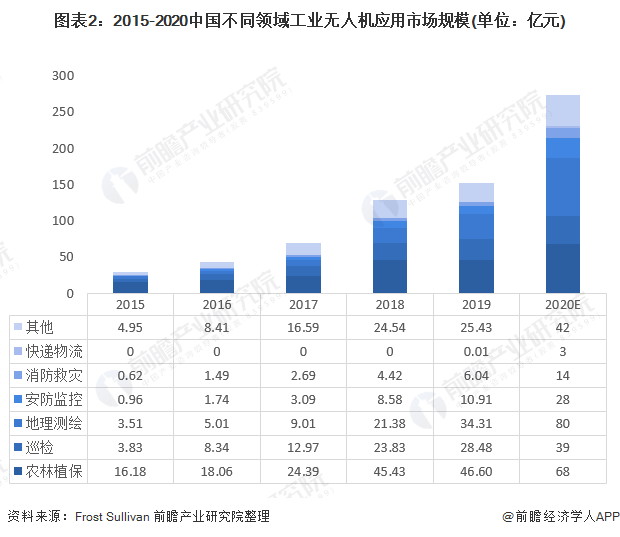 从应用规模上看,2015年以来,我国不同领域工业无人机应用规模逐年上升。2019年,我国农林植保、巡检、地理测绘、安防监控、消防救灾、快递物流领域市场应用规模分别为46.6亿元、28.48亿元、34.31亿元、10.91亿元、6.04亿元、0.01亿元。