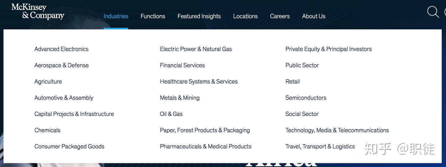 所以,我们今天可以看到,麦肯锡的行业分类事业部制已经划分得很细了,官网上列示的industries就有21个: