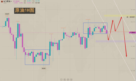 原油当前上方的阻力是63位置,依托此盘整压力做空,下方短线支撑是60.5位置,这是此前58.5-60.5位置盘整支撑,一旦破位,原油将会开启瀑布式下跌。