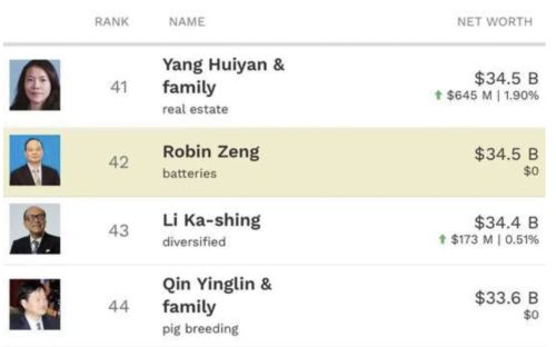 据福布斯实时富豪榜数据显示,宁德时代董事局主席曾毓群以345亿美元身价,超过了李兆基的321亿美元,也超过了李嘉诚的344亿美元,成为香港新首富。