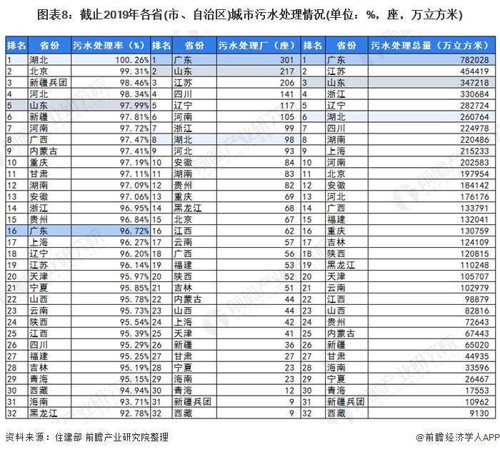 注:污水处理率为前瞻根据住建部公布的各省(市、自治区)城市污水排放量及污水处理量数据进行的测算,污水处理率=各省(市、自治区)城市污水处理量/污水排放量。