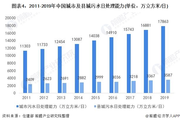 得益于污水处理设施的建设,城市及县城污水处理能力稳步提升。城市污水日处理能力由2011年的11303万立方米/日上升至2019年的17863万立方米/日;县城污水日处理能力也由2011年的2409万立方米/日上升至2019年的3587万立方米/日。
