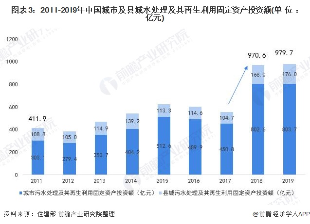 在投资额方面,2011-2017年,我国城市及县城污水处理及其再生利用固定资产投资额维持在350-650亿元区间范围内。2018年,我国城市及县城污水处理及其再生利用固定资产投资额大幅增长,达到970.6亿元,2019年投资额再创新高,达到979.7亿元。