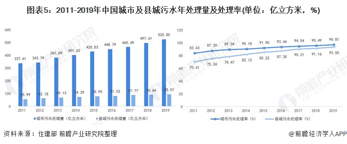 截止2019年底,我国城市及县城年污水处理量分别达到了525.85亿立方米和95.01亿立方米,污水处理率分别达到了96.81%和93.55%。城市及县城污水处理率已经提前完成了“十三五”时期规划的污水处理率目标(“十三五”规划目标:到2020年底,城市污水处理率目标为95%,县城污水处理率目标为85%,东部地区县城力争达到90%)。