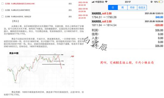 回顾周四,黄金日内震荡徘徊,美盘突破1800。笔者给出1800下看空策略,实盘进场后止损出局。最终盈利300美元。蚊子再小也是肉,只要能保证资金,盈利大于亏损,才能稳定获利。