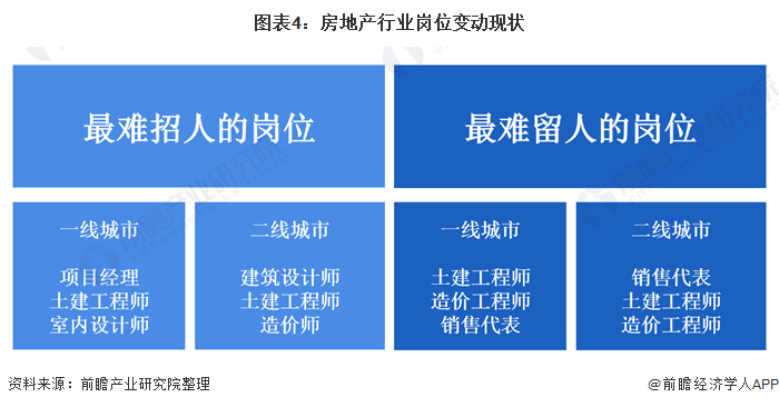 从不同岗位人才需求看,房地产行业主要岗位主要分为技术类、项目类、采购类、市场策划类和销售类,其中技术类岗位和项目类岗位对技术和经验要求较高。目前,我国房地产行业需求缺口较大的岗位是土建工程师。