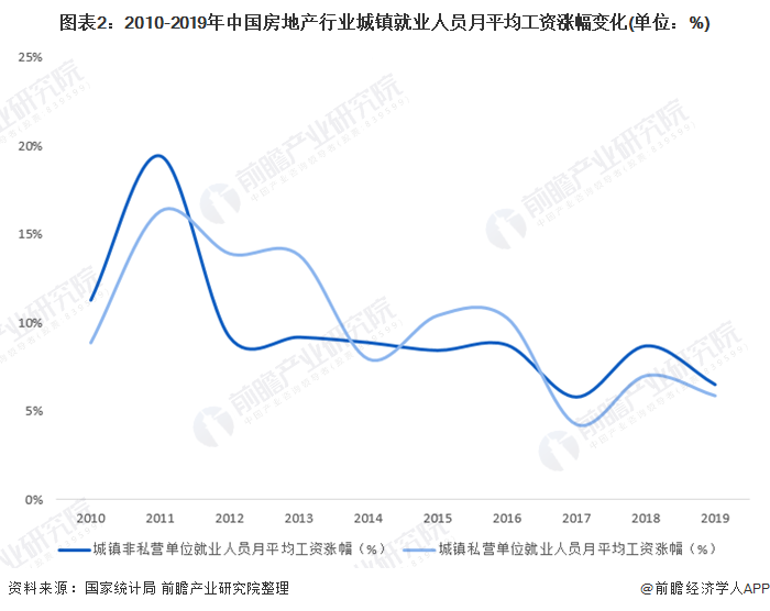 但从涨幅变化情况来看,涨幅呈波动下降的变化趋势,2019年,我国房地产行业城镇私营单位与非私营单位就业人员月平均工资增速分别为5.88%、6.47%。