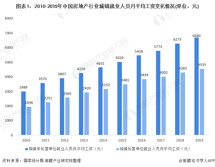 近年来,我国房地产行业城镇私营单位与非私营单位就业人员月平均工资逐年增长,2019年,我国房地产行业城镇私营单位与非私营单位就业人员月平均工资分别为4535元、6680元。