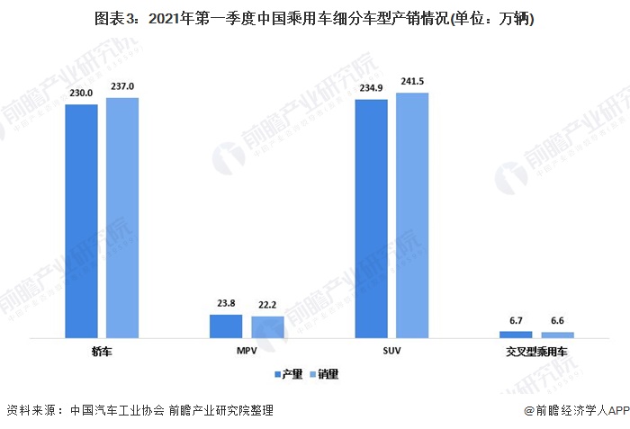 分车型看,轿车产销分别完成230万辆和237.2万辆,同比分别增长84.4%和77.4%;SUV产销分别完成234.9万辆和241.5万辆,同比分别增长81.3%和75%;MPV产销分别完成23.8万辆和22.2万辆,同比分别增长109.7%和63.3%;交叉型乘用车产销分别完成6.7万辆和6.6万辆,同比分别增长36.4%和46.4%。
