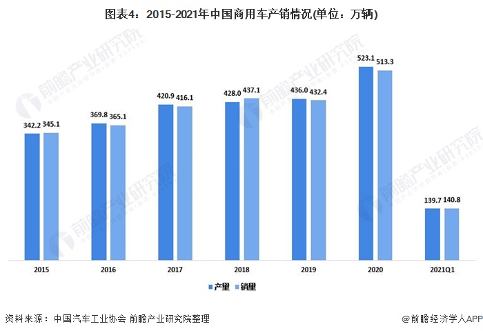 2020年,受国Ⅲ汽车淘汰、治超加严以及基建投资等因素的拉动,商用车全年产销呈现大幅增长。2021年第一季度,商用车产销延续了增长趋势。2021年第一季度,商用车产销分别完成139.7万辆和140.8万辆,同比分别增长76.9%和77.3%。