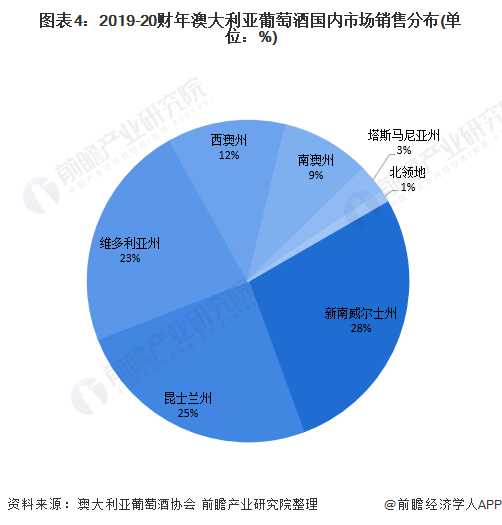在澳大利亚本国消费方面,2019-20财年,新南威尔士州、昆士兰州和维多利亚州的葡萄酒消费量最多,消费占比均在20%以上。