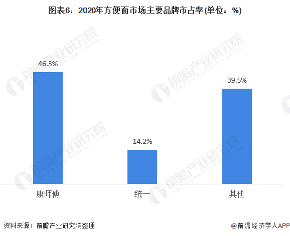 根据尼尔森数据,2020年方便面行业整体销量同比增长0.1%,销售额同比增长4.7%,据此估算,2020年方便面行业整体销售额为637亿元。康师傅销售额为295亿元,市占率达46.3%,位于第一;统一方便面业务收入90.55亿元,占比约为14.2%。仅康师傅与统一两个品牌占据60.5%的市场。