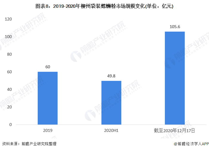 从国内市场看,随着螺蛳粉在全国的不断普及,柳州市当地的螺蛳粉产业销售额迅速增长。数据显示,2019年,柳州市袋装螺蛳粉产值突破60亿元,2020年上半年已经达到49.8亿元,截至2020年12月17日,袋装柳州螺蛳粉产销突破百亿,达到105.60亿元,日产量高达325万袋。