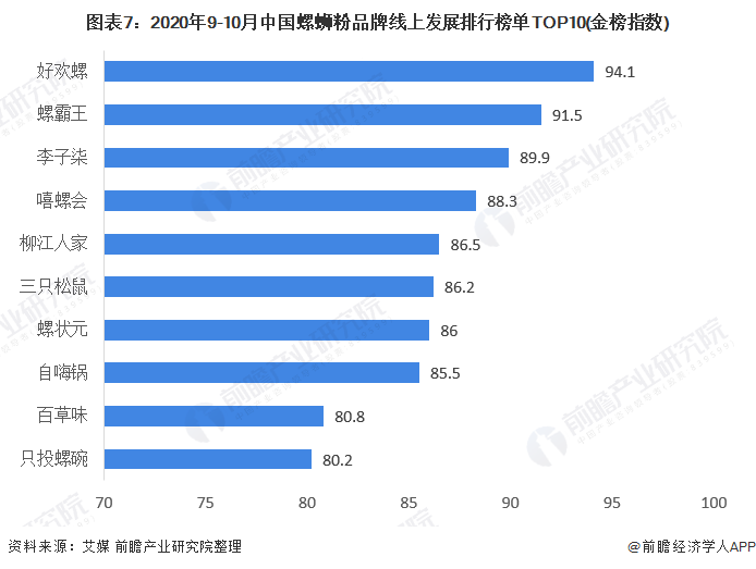 相比之下,螺狮粉市场刚刚形成,还没有固定份额格局,厂商处于同一起跑线。2020年10月,艾媒发布《2020年9-10月中国螺蛳粉品牌线上发展排行榜单TOP10》,好欢螺以94.1的金榜指数摘得桂冠,螺霸王、李子柒分别以91.5、89.9的金榜指数分列第二、第三。