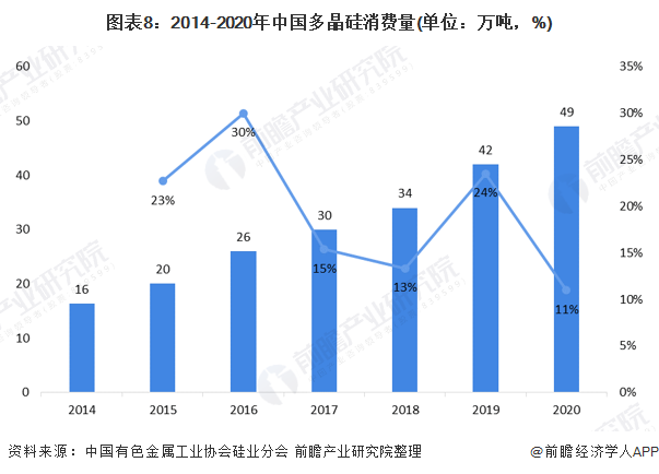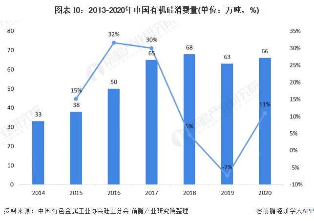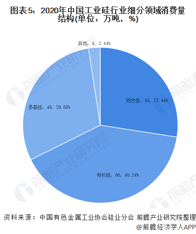 根据中国有色金属工业协会硅业分会的统计数据显示,在2020年国内下游需求方面,分不同领域来看,铝合金行业全年消费工业硅45万吨,同比下降2.1%,占国内消费总量的27.4%;有机硅行业全年消费工业硅66万吨,同比上涨4.7%,占国内消费总量的40.2%;多晶硅行业全年消费工业硅49万吨,同比增长16.6%,占国内消费总量的29.8%。