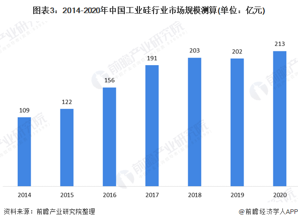 前瞻根据近年来工业硅的均价测算中国工业硅行业市场规模;根据前瞻的调查,中国工业硅的价格均价约为13000元/吨,因此前瞻测算2020年中国工业硅市场规模约为213亿元。