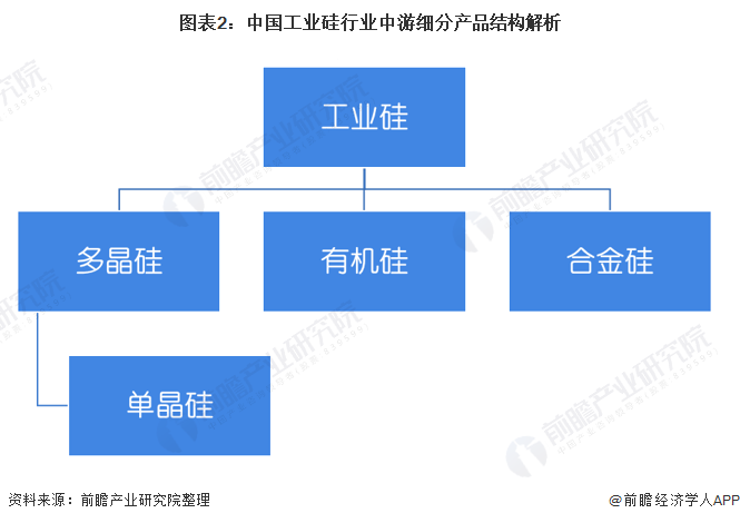 工业硅的细分产品主要分为多晶硅、有机硅和合金硅;其中,多晶硅又可以进一步冶炼成单晶硅。