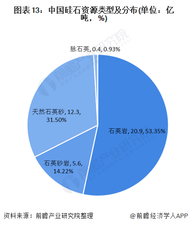 从硅石资源类型来看,石英岩的保有量为20.9亿吨,占据我国硅石资源储量的53.35%;其次是天然石英砂12.3亿吨,占据31.5%;再者是石英砂岩5.6亿吨,占据14.22%;脉石英0.4亿吨,占据0.93%。