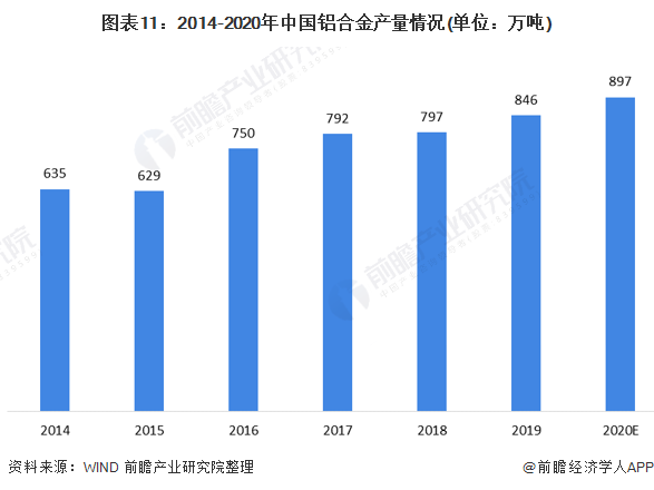 中国铝合金产品广泛应用于下游领域像是汽车轻量化发展、电子消费品增长、建筑材料等;领域需求上升等因素持续拉动中国铝合金产品的市场需求的上涨。根据WIND的数据显示,中国铝合金产量从2014年的635万吨上升至2019年的846万吨,年复合增速达到5%。