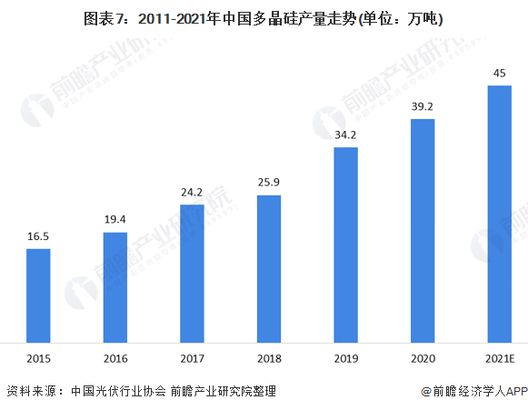 根据中国光伏行业协会的数据显示,2015-2020年中国多晶硅产量不断增加;2020年,全国多晶硅产量达39.2万吨,同比增长14.6%。其中,排名前五企业产量占国内多晶硅总产量87.5%,其中4家企业产量超过5万吨。2021年随着多晶硅企业技改及新建产能的释放,产量预计将达到45万吨。
