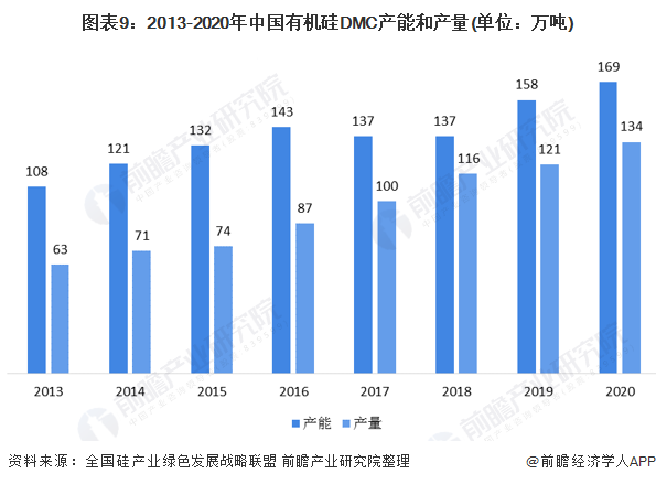 根据全国硅产业绿色发展战略联盟的数据显示,截至2020年底中国有机硅DMC产能约169万吨,同比增长6.3%,新增产能来自兴发集团与新安股份;2020年全年累计产量134万吨,同比增长11.5%,行业开工率约80.0%。