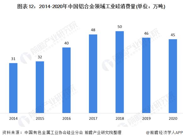 根据中国有色金属工业协会硅业分会的数据显示,2019年我国工业硅在铝合金合金领域消费量为46万吨,同比下滑8.0%,2014-2019年复合增长9.9%。而在2020年,由于新冠肺炎的疫情,全球汽车处于低迷态势导致铝合金领域工业硅消费量呈现下跌趋势,达到45万吨。