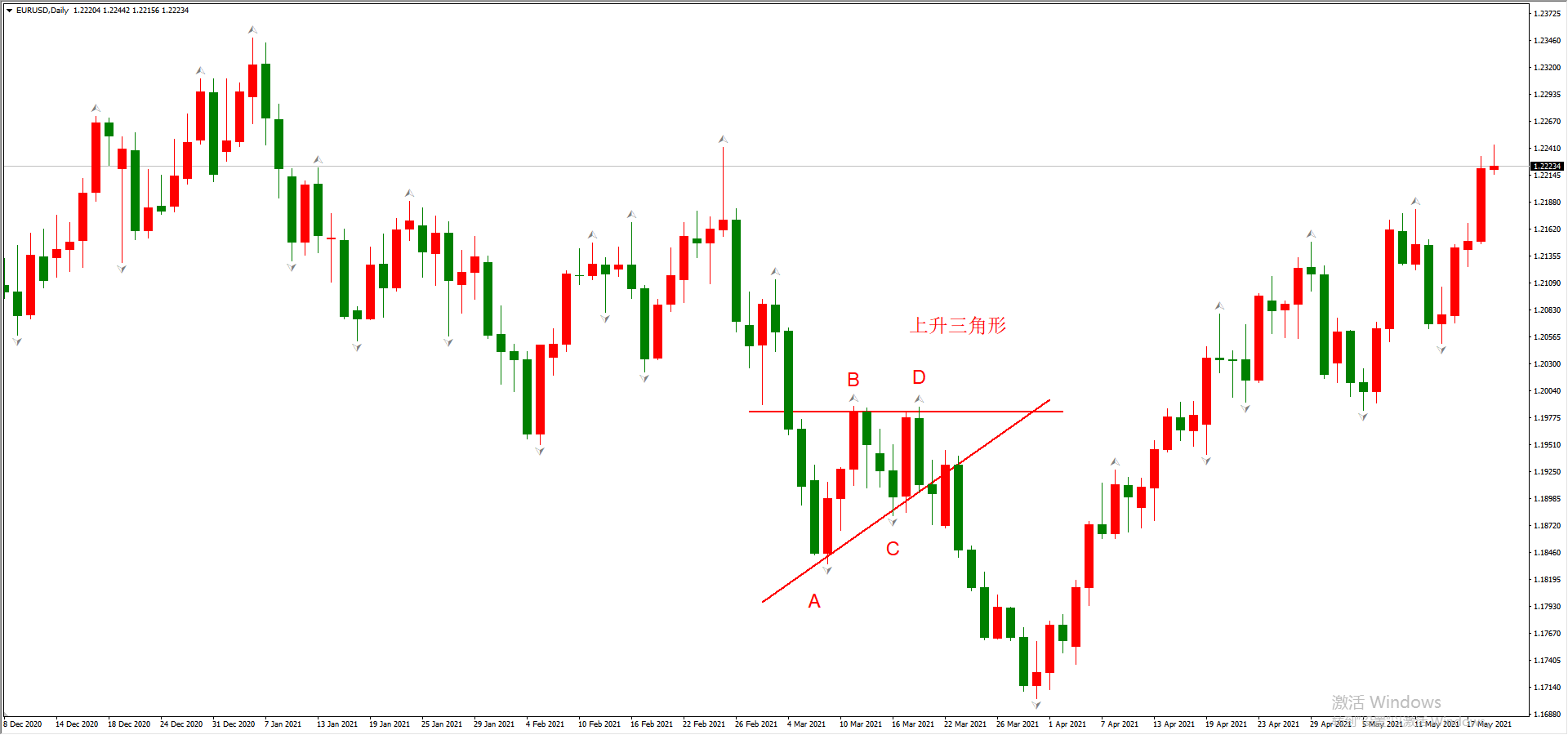 上升三角形由ABCD四个关键点构成,其中A为底分形、B为顶分形、C为底分形、D为顶分形,也就是顶分形与底分形交错形成。其中ABC所构成的结构,很容易在盘中误认为是反转结构,因为经常有交易者认为“最新的低点没有突破前一个低点,则代表123结构形成,未来将会出现转势”。BD两个高点,构成了M顶结构。其实,上升三角形与M顶结构之间有异曲同工之妙。上升三角形意味着行情中继,在下方直线被有效突破后,则形成做空信号。有效突破的定义是,最新K线的高点处于三角形下方直线之下。