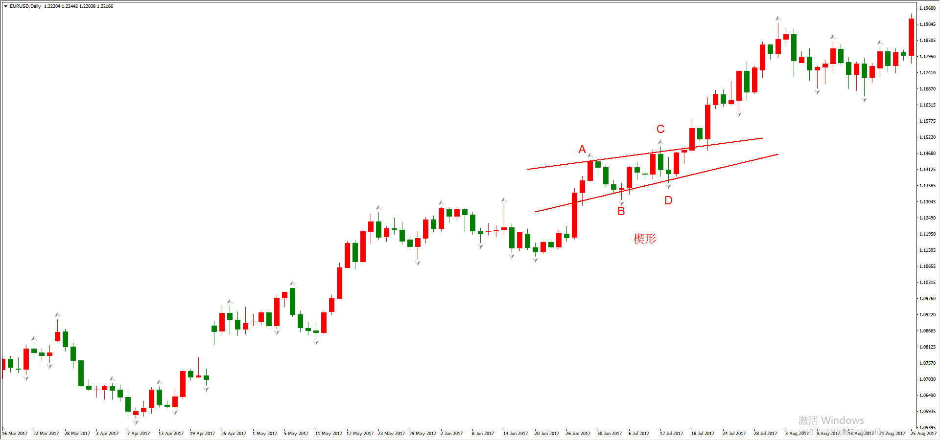 楔形形态较为特殊,虽然它也是由两个高点和两个低点依次连线而成,但两个高点和两个低点必须均为“依次抬高”或者均为“依次降低”。这有点类似于通道线,只不过阻力线和支撑线并不相互平行。对于多头趋势中的楔形来说,支撑线的角度要比阻力线的角度要更陡峭;对于空头趋势来说,阻力线的角度要比支撑线的角度更陡峭。只有两条线的倾斜角度不同,才能够保证两条线能够在延长后相交于一点,也就是形成“拉长”的三角形结构。楔形出现的频率要比三角形更高,因为它对高低点的要求不像三角形形态那么严格。