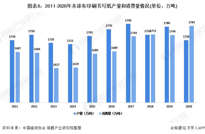 2020年我国未涂布印刷书写纸生产量为1730万吨,较2019年下降2.81%;消费量为1783万吨,较2019年增长1.94%。2011-2020年生产量年均增长率为零,消费量年均增长率为0.62%。