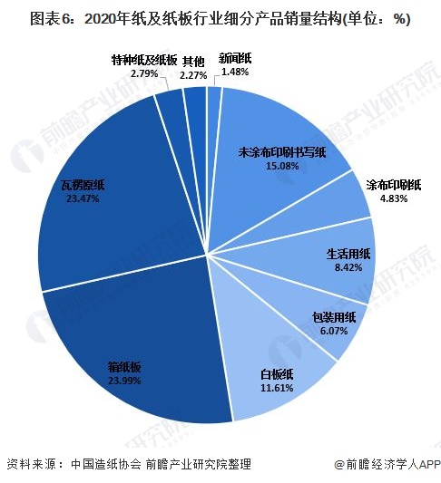 从销量结构来看,2020年我国箱纸板销量为2837万吨,较2019年同比增长18.06%,占纸及纸板行业总销量的23.99%;瓦楞原纸销量2776万吨,较2019年增长16.93%,占纸及纸板行业总销量的23.47%;未涂布印刷书写纸销量为1783万吨,较2019年增长1.94%,占纸及纸板行业总销量的15.08%。
