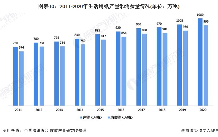 2020年我国生活用纸产量为1080万吨,较2019年增长7.46%;消费量为996万吨,较2019年增长7.10%。2010-2020年生产量年均增长率4.45%,消费量年均增长率4.43%。
