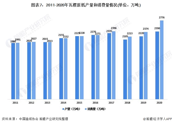 2020年我国瓦楞原纸生产量为2390万吨,较2019年增长7.66%;消费量为2776万吨,较2019年增长16.93%。2011-2020年生产量年均增长率为2.11%,消费量年均增长率为3.76%。