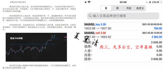 周三的行情整体看来犹如过山车,笔者在文中给出的多单策略;黄金在白盘一直属于低多。凌晨时黄金暴跌,笔者所持有的空单也顺利获利。行情千变万化,市场没有绝对的多或空,随机应变,只要单子进去能赚到钱就行,其他的都是空谈。